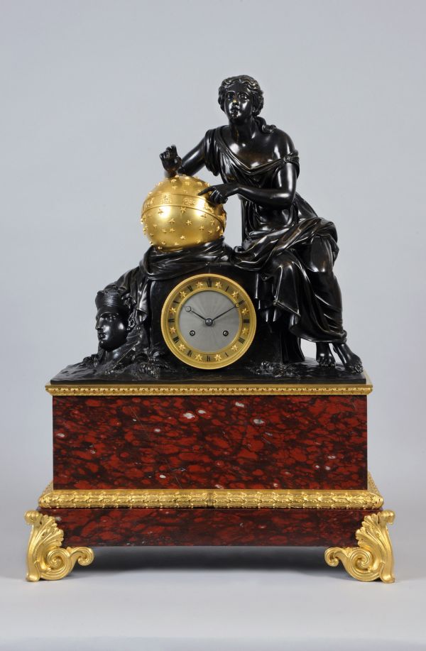 Pendule comprenant un large socle en marbre griotte rouge avec plinthe à décor de feuilles de lauriers. Deux pieds antérieurs en angle formés par une acanthe à crosse entre deux rinceaux à double volutes. Deux pieds postérieurs carrés unis. Au-dessus, un groupe en bronze patiné comprenant un socle, sorte de bloc de pierre, dans lequel s’inscrit le cadran circulaire en métal blanc à couronne doré avec chiffres romains noirs et étoiles. A droite, une femme drapée, figurant l’Astronomie, est assise et indique les signes du zodiaque sur une sphère dorée parsemée d’étoiles. A gauche, au sol, une tête de sphinx recouverte partiellement d’un voile tombant de la sphère, figure l’Egypte.