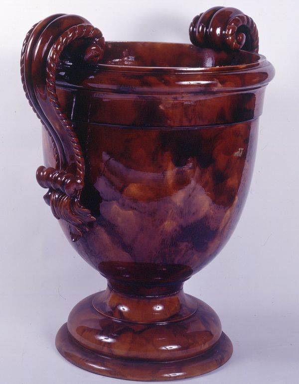 Forme urne. Grand piédouche à tore et gorge ; le corps uni, évasé, à bord vertical mouluré. Deux grandes anses en crossette, bordées cordes terminées en feuilles d'acanthe.