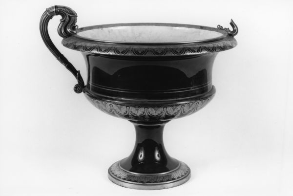 Forme médicis évasé ; pied à moulure doucine décorée de feuilles d'acanthe or entre listels or ; dessous de la panse décoré d'une frise de feuilles d'acanthe séparées par chutes de culots, le bord extérieur même décor.