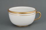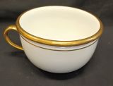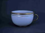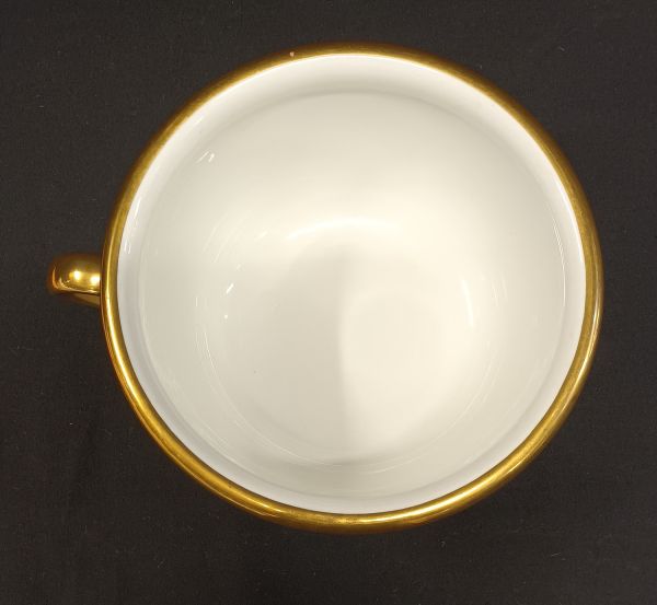 Forme générale 1/2 sphérique sur petite bague dorée en retrait, sommet à gorge après filet doré et recouverte d'un gros arrondi filant avec l'intérieur et doré par moitié. Poignée en arc dorée.