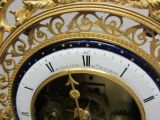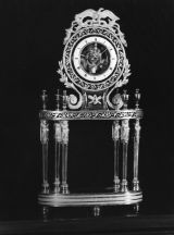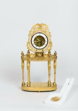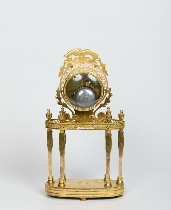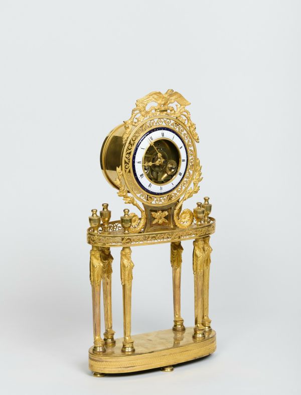 Quatre pieds patins moulurés placés aux extrémités médianes du socle ovale décoré de feuilles d'eau. 6 colonnes cariatides, terminées par des vases à couvercle, soutiennent un plateau à bord orné de rinceaux ajourés. Sur celui-ci repose un carré aux côtés concaves et décoré au centre d'un trophée. Cadran circulaire en émail blanc à chiffres romains noirs et signé : "Warnier l'aîné à Paris". Au centre, mécanisme apparent. Au sommet, un sigle aux ailes déployées en bronze doré.
