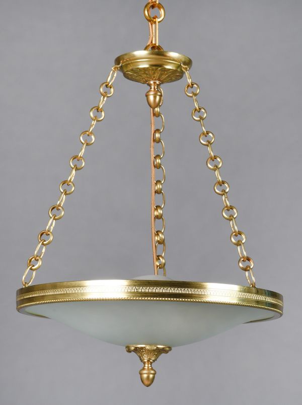 - Verre bombé cristal dépoli cerclé de bronze doré, sculpté d'un rang de perles et d'une frise de feuilles le tout relié par 3 chaines au sommet sculpté de feuilles nervées et d'une pomme de pin.