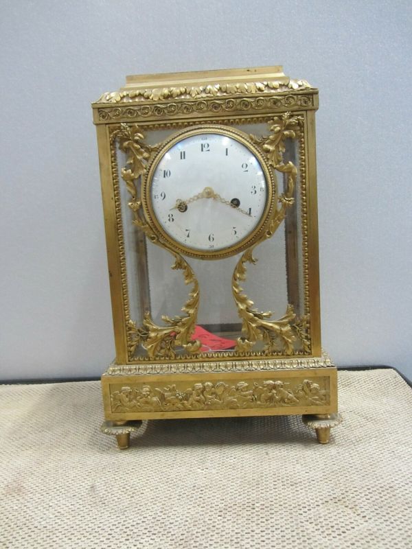 Une pendule cage en bronze ciselé et doré à décor de feuilles d'eau, perles, rais de cœur, guilloché, feuilles d'acanthe. Base à frise de jeux d'amours sur toutes les faces. Le cadran est retenu par deux guirlandes de rinceaux feuillagés, haies et épis de blé.