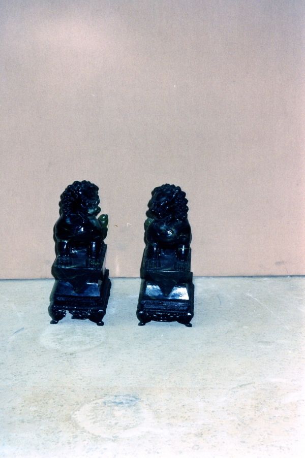 Lion de Fô en jadéïte foncé, menaçant assis sur son arrière et tourné soit à droite ou à gauche. Socle de bois foncé ajouré.