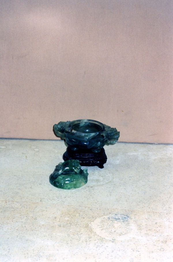 Cette coupe tripode porte deux anses-masques et son couvercle, un lion de Fô.