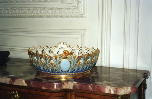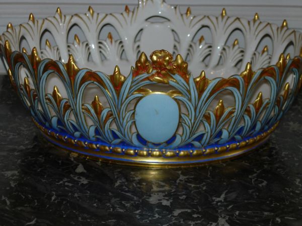 Corbeille ajourée de plan circulaire, décor bleu ciel, bleu outre-mer et or, bordure formée d'un double bandeau ajouré de roseaux encadrant deux iris formant entourage pour un médaillon.