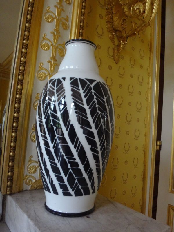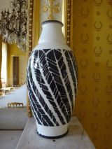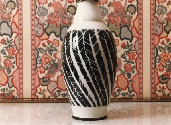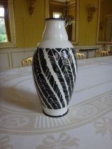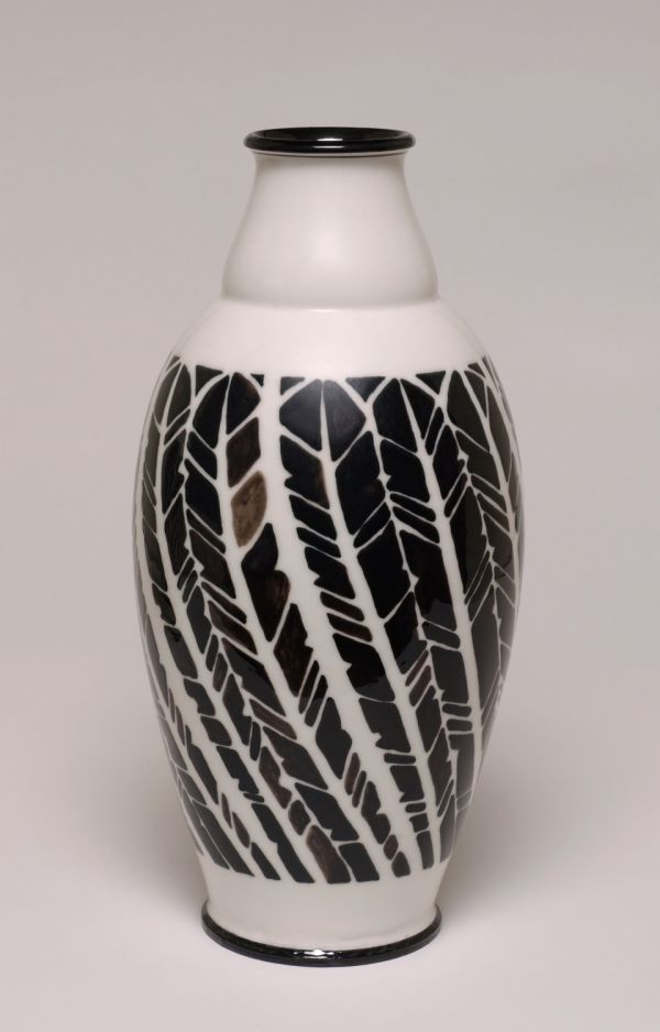 Forme ovoïde à col se resserrant. Décor de plumes noires stylisées sur fond blanc. Pâte dure nouvelle.