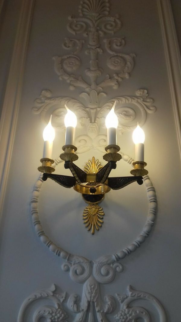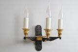 Patère rectangulaire, les extrémités en demi-cercle, en bronze noir ciselé de rinceaux et palmettes, supportant au centre un anneau circulaire doré à fond creux moletté portant 3 consoles en doucine en bronze noir ciselé latéralement et ciselé doré de lauriers à la base, sommet à 1 bougeoir chacune tourné en vase à bande ciselée de feuilles. Coupelles et bougies verre.