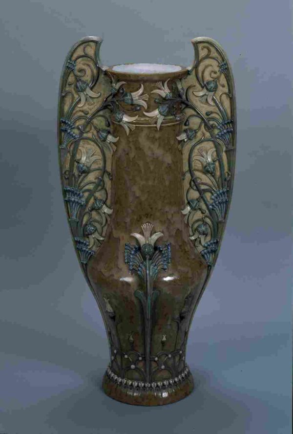forme balustre à long col encadré sur toute sa hauteur par deux anses saillantes pleinte à décor de fleurs de chardons en relief sur fond beige clair nuagé. le fond d'une couleur générale caramel. Au centre de chaque face une fleur en fort relief ainsi qu'au col à la base décor de feuillages et de boutons de fleurs le pied et décoré d'un rang de boutons de fleurs.