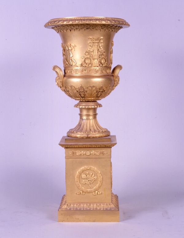 Plinthe unie surmontée de moulure en doucine décorée de feuilles et de fleurettes 4 faces du socle décorées de couronnes enrubannées contenant des instruments de musique (harpe, flûte de pan, cymbales, double flûte) piédouche à cannelures. Panse à palmettes ajourées et feuilles d'acanthe deux anses avec masques féminins. Frise avec candélabres, femme ailée tenant une urne et amour jouant de la double flûte, femme jouant de la lyre et amour accoudé sur sa torche - guirlande de feuilles de lierre - Bordure à godron et perles.