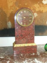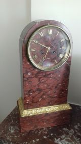 Plinthe unie surmontée d'une moulure de bronze en doucine décorée de feuilles d'acanthe et de culots alternés, séparés par des S affrontés aux angles. Palmette surmontée d'un masque d'homme barbu. Borne arrondi, bague unie autour du cadran. Chiffres romains fixés directement sur le marbre.