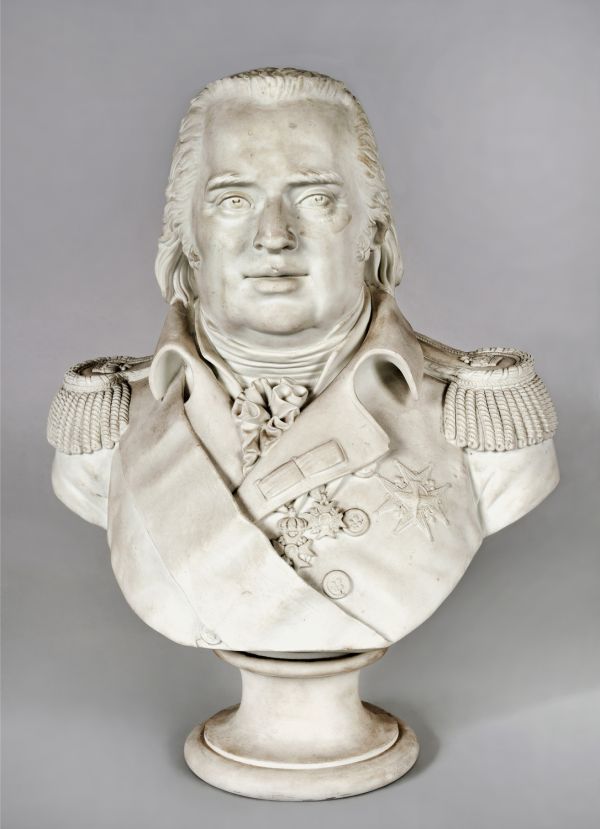 Louis XVIII porte une veste croisée à épaulettes à franges, col renversé et à revers croisé sur la poitrine avec une cravate à jabot. L'ensemble est orné de l'écharpe de la légion d'honneur, de boutons à fleur de lys, de la plaque de l'ordre du Saint-Esprit, des croix de l'ordre de Saint-Louis et de la Légion d'honneur.