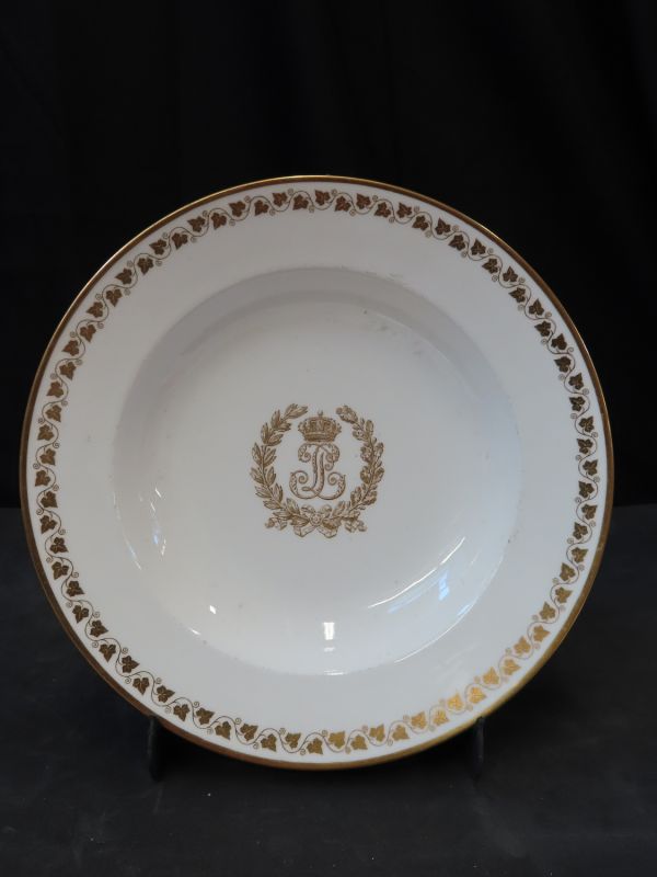 Bordure de tiges de lierre courantes or. Au centre monogramme LP enlacés couronnés dans une couronne enrubannée de chêne et laurier or.