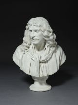 Plâtre. Tête de 3/4 avec calotte sur cheveux flottants, buste drapé et écharpe nouée.