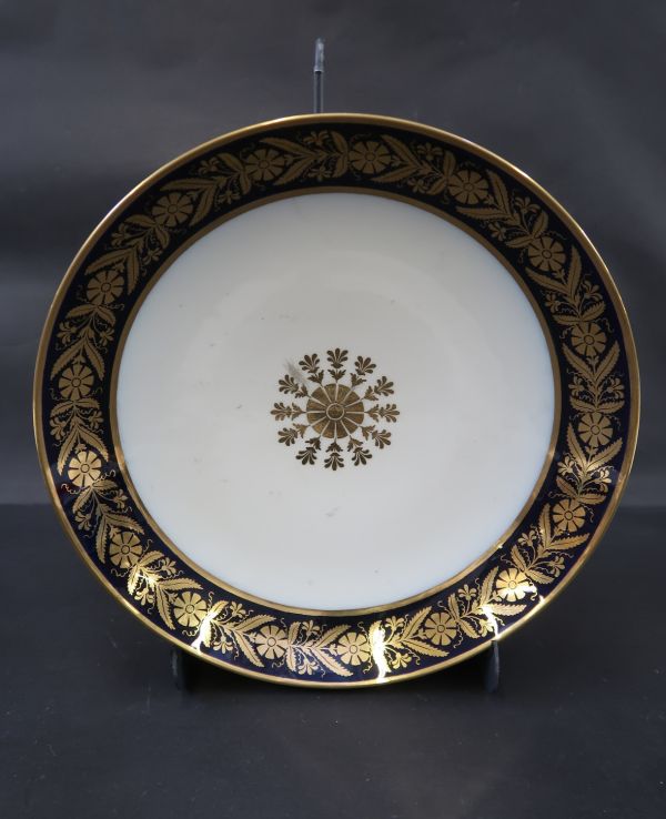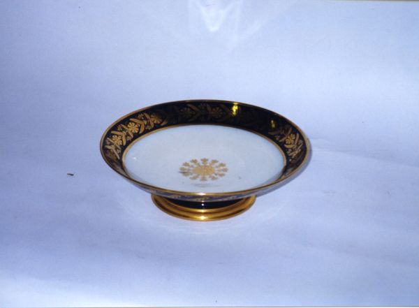 Pied mouluré et or cavet bleu. Fond de la coupe extérieure blanc bord à frise de petites palmes en feuilles or sur fond bleu. Intérieur, rosace or sur fond blanc, frise de fleurettes et feuillages or sur fond blanc.
