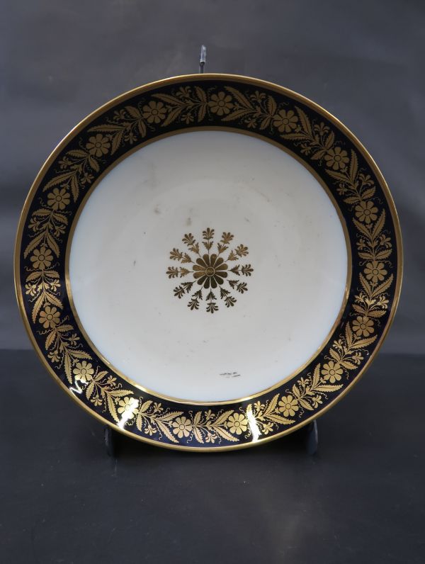 Pied mouluré et or cavet bleu. Fond de la coupe extérieure blanc bord à frise de petites palmes en feuilles or sur fond bleu. Intérieur, rosace or sur fond blanc, frise de fleurettes et feuillages or sur fond blanc.