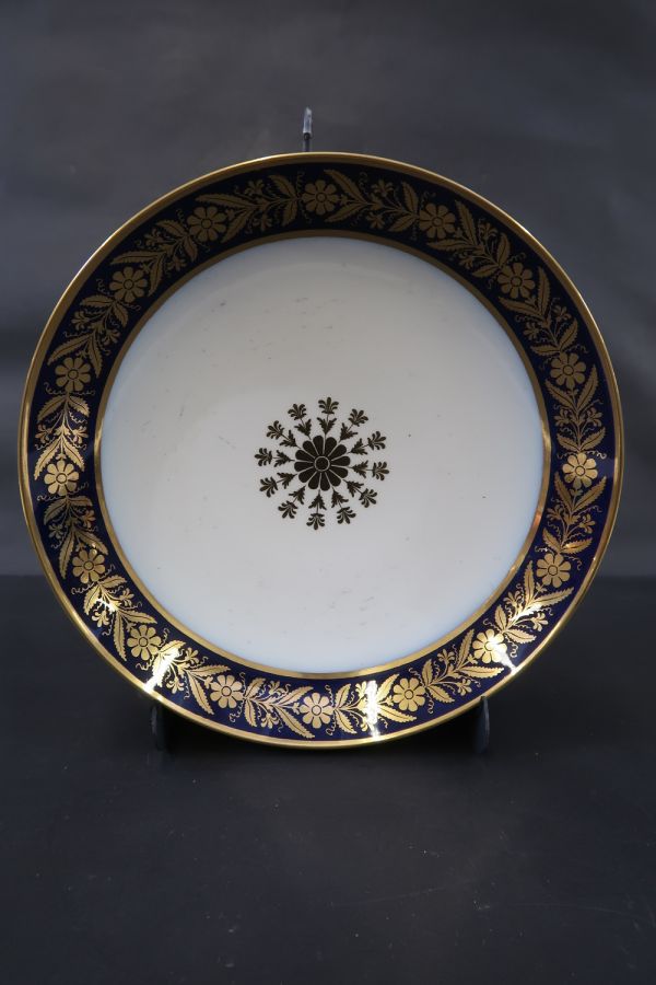 Pied mouluré et or cavet bleu. Fond de la coupe extérieure blanc bord à frise de petites palmes en feuilles or sur fond bleu. Intérieur, rosace or sur fond blanc, frise de fleurettes et feuillages or sur fond blanc.