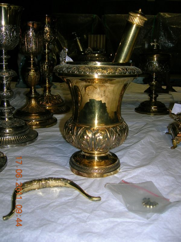 L'anse et le goupillon, perdus lors du sac des Tuileries en 1830 sont remplacés sous Louis-Philippe par Sixte-Simon Rode. Le goupillon en bronze doré est ajouté après 1848.