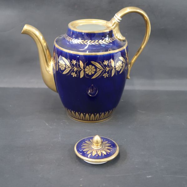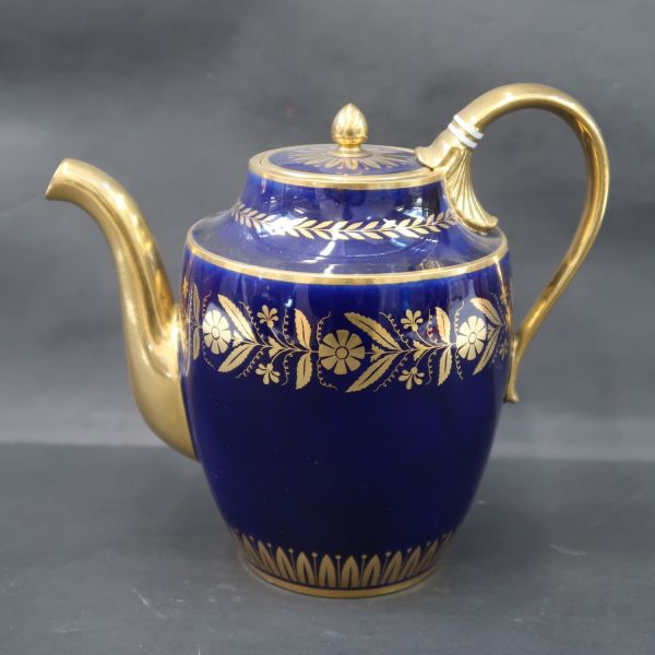 Forme ventrue à grand cavet - Bec, anse, bouton uni, or plein ; décor de frises, feuilles d'eau, rosaces fleurettes et feuillages, branches rectilignes de laurier, or, entre filets or sur fond bleu - Couvercle plat.