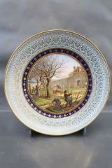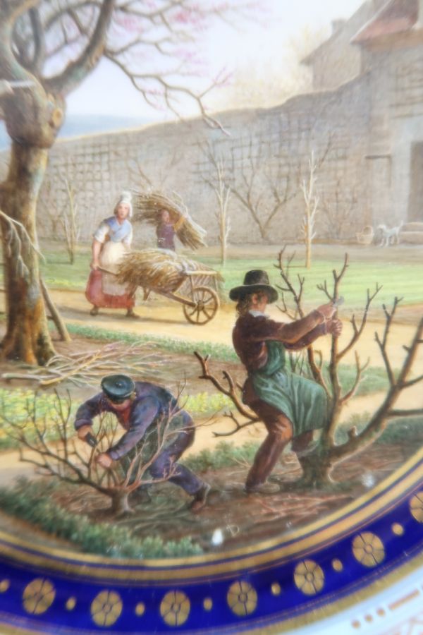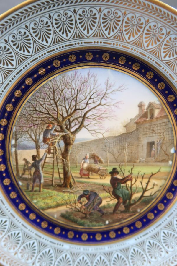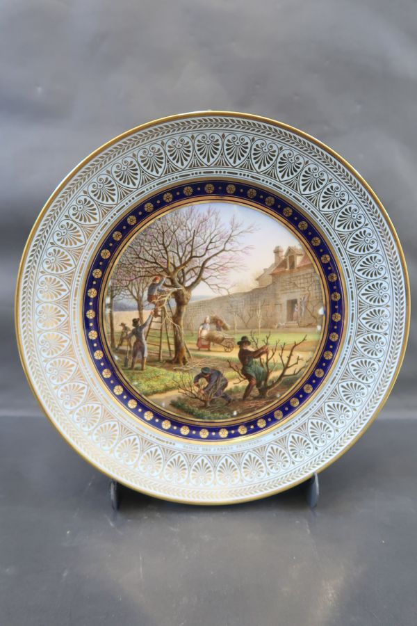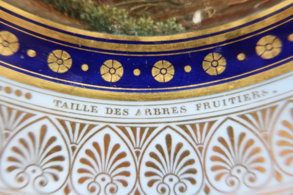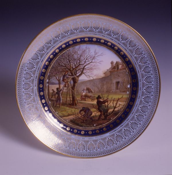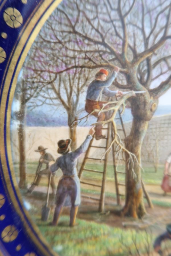 Marli bleu lavé en frise de palmettes or entre de petites feuilles de perles et pirouettes. Cercle de rosaces or alternées de points or entre filets or sur fond bleu. Jardinier dans un verger enclos de mur, occupé à la taille.