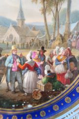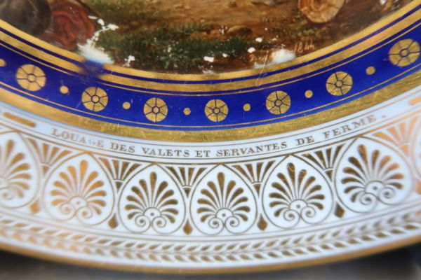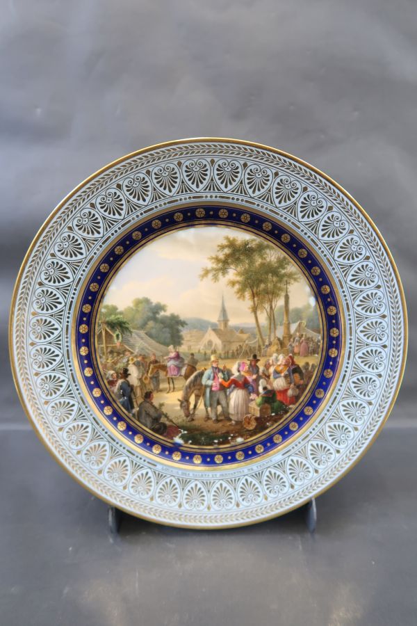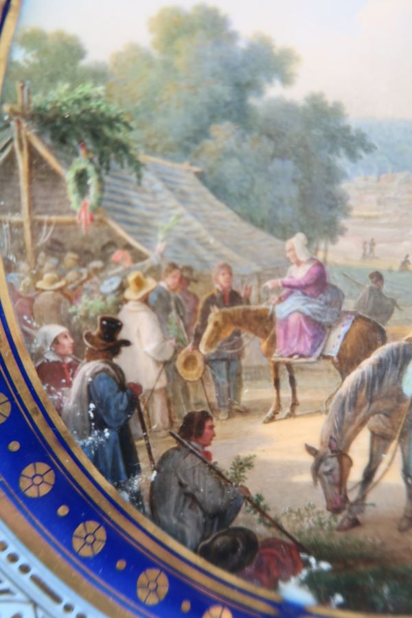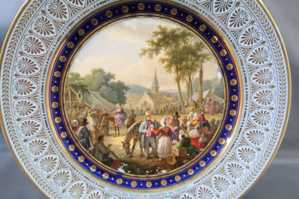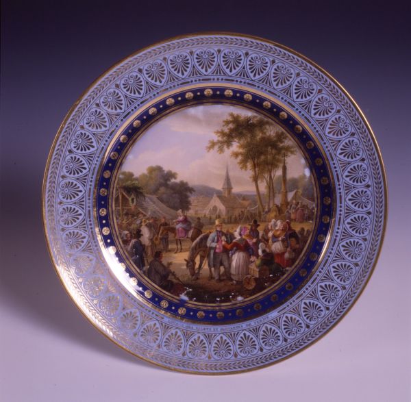 Marli bleu lavé en frise de palmettes entre de petites feuilles de perles et pirouettes. Cercle de rosaces or alternées de points or entre filets or sur fond bleu. Sur un champ de foire devant un village : présentation des servantes et des valets de ferme.