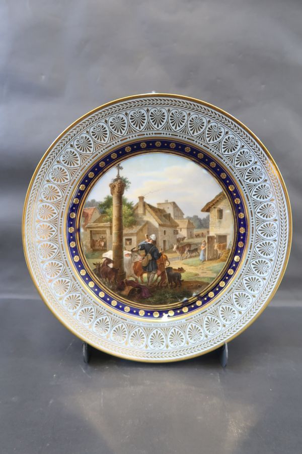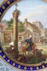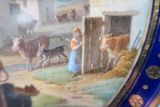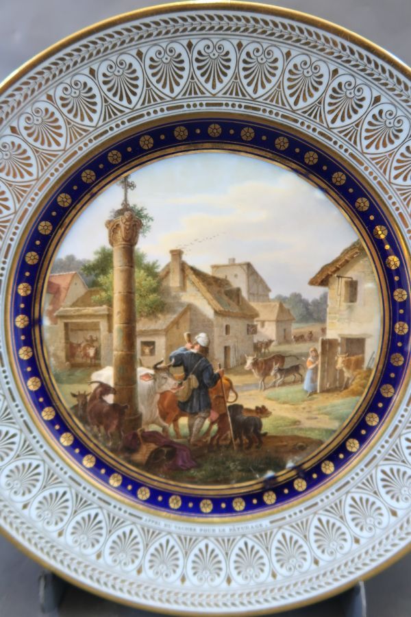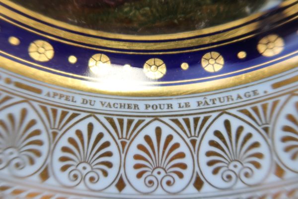 Marli bleu lavé en frise de palmettes or entre de petites feuilles de perles et pirouettes. Cercle de rosaces or alternées de points or entre filets or sur fond bleu. Pont de village. Au 1er plan : le vacher sonnant du cor, les animaux sortant des étables.