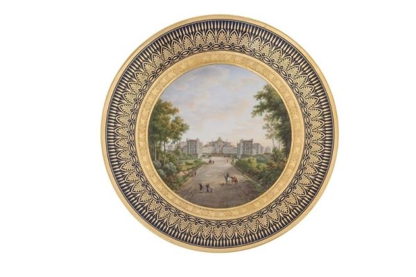 Appartient à un service de 36 assiettes livrées à Louis XVIII en 1816 pour le palais des Tuileries après leur présentation à l'exposition des produits des manufactures royales de Sèvres.