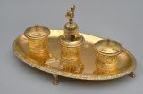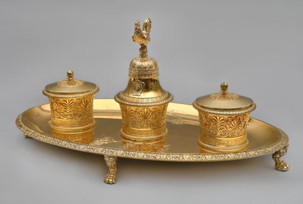 Plateau ovale légèrement concave reposant sur quatre jarrets à griffes de lion, et ceint d'une frise de flèches, d'acanthes et de feuilles d’eau en applique. Sur le plateau sont trois récipients alignés, tournés et évasés, ciselés d'une frise de fleurs dans la partie inférieure, et d'une frise de palmettes dans la partie supérieure. Ces récipients, contenaient l'encre, l'éponge, et la poudre nécessaires à l'écriture. Le récipient central est coiffé d'une sonnette (ou clochette) ornée de palmettes sur le bord, d'entrelacs et de feuilles d'eau en rosace sur le culot. Un écusson aux armes royales de France sur la doucine. La prise figure un coq gaulois. Les récipients secondaires possèdent chacun un couvercle orné d'une rosace et sommé d'une pomme de pin faisant bouton. Le creux du plateau est orné, d'une part, de deux Victoires affrontées, figures ailées tenant des lauriers et tendant des palmes, sous lesquelles se trouve un écusson aux armes royales de France, rapporté sous la Restauration. De l'autre côté deux cornes d'abondance encadrent le monogramme de Louis XVIII, qui remplace celui de Napoléon.