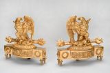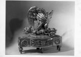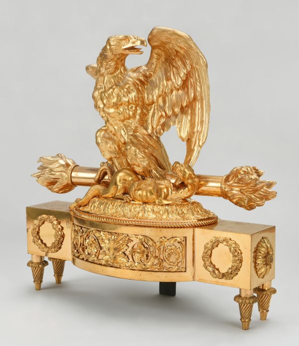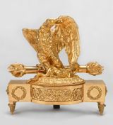 Socle rectangulaire dont le milieu saillant en anse de panier est orné de culots et rinceaux découpés et ciselés, les extrémités sont décorées de rosace et couronne de fleurs. Le socle est porté par quatre pieds en cône torsadé. Ce socle est surmonté d'une terrasse ovale en doucine ciselée sur laquelle se dresse un aigle aux ailes déployées, tenant dans ses serres le bâton de foudre et une salamandre.