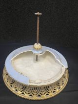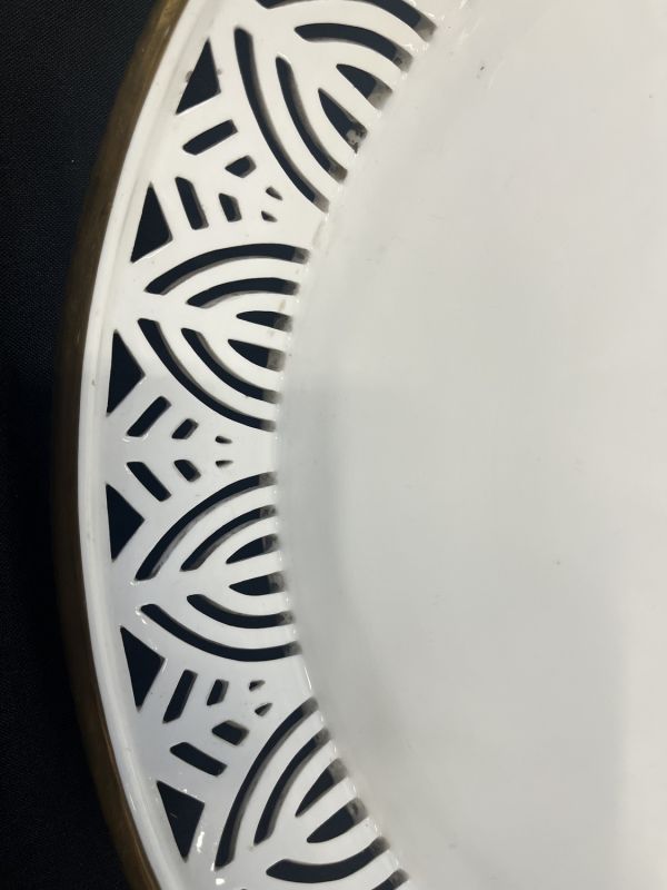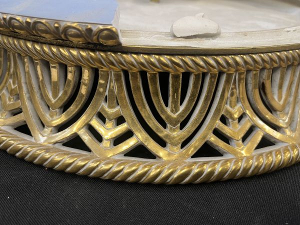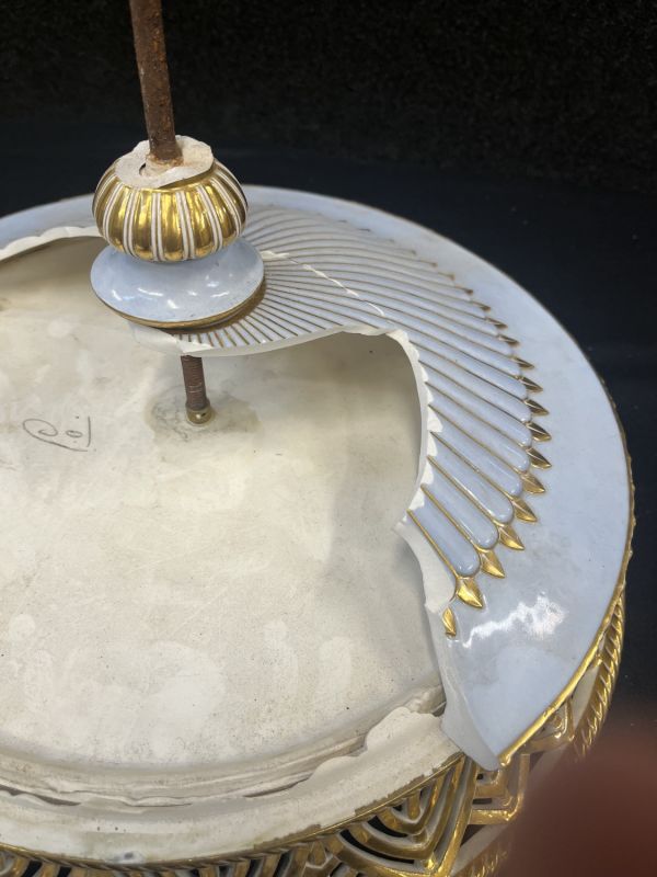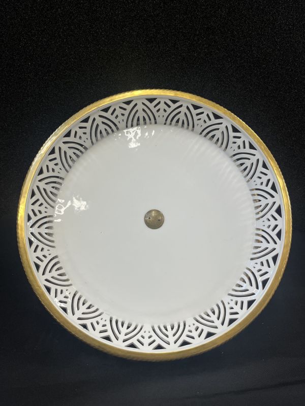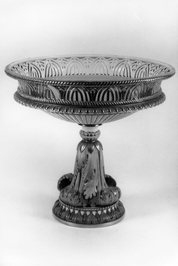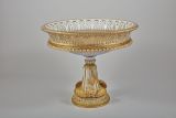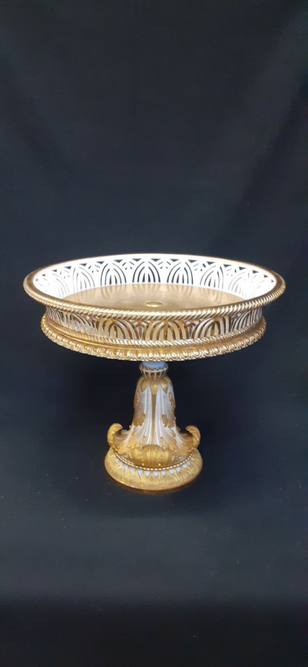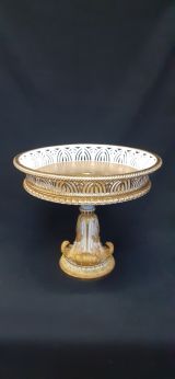Base circulaire à rais de coeur or et perles, surmontée d'un gros culot renversé à 4 feuilles d'acanthe or mat et nervures blanches. Partie supérieure à petit piédouche à godrons en relief sertis filets or. Le bord en quart de jonc orné d'oves or, surmonté du bord de la coupe en cavet ajourée en ogives et cordée haut et bas, face or, intérieur blanc.