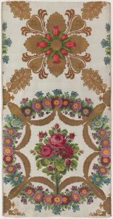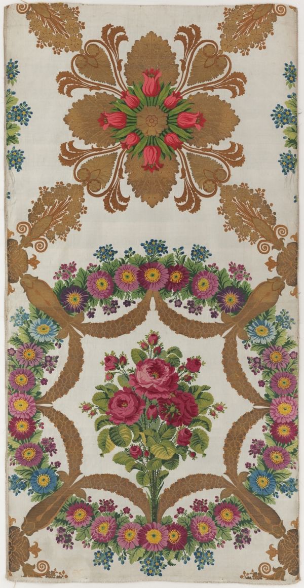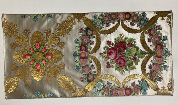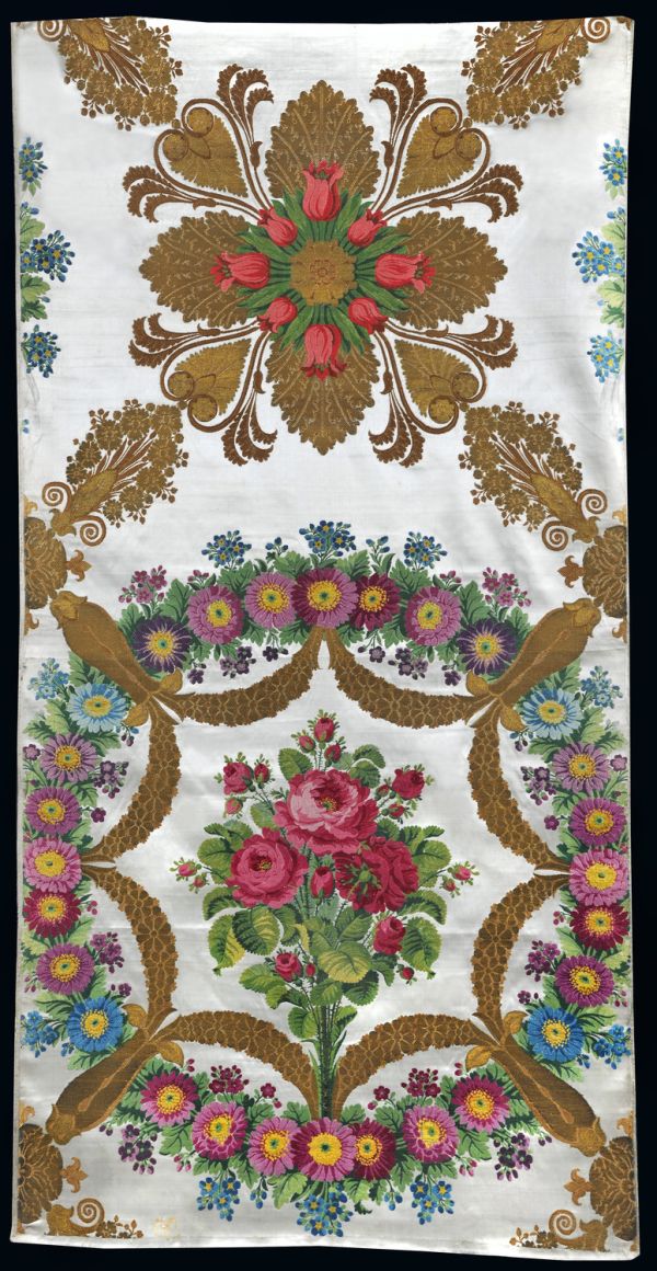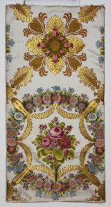 Tenture, portières ou cantonnières en satin fond blanc broché en dorure et soie nuée de diverses couleurs, à dessin de couronnes de marguerites dans lesquelles se trouve un rosier et une rosace de fleurs impériales, alternant avec des couronnes de tulipes, le tout lié par des ornements or et soie.