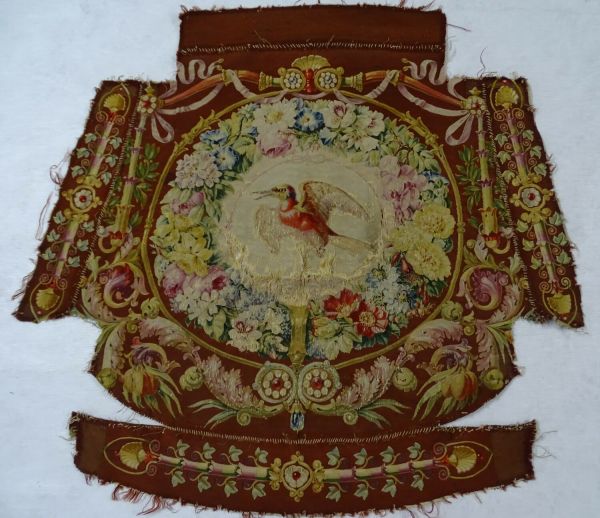 Décor : oiseau sur fond écru entouré d'une riche guirlande florale encadrée par un médaillon, dans un cadre à joyaux. Contrefond marron. Plate-bandes cousues.