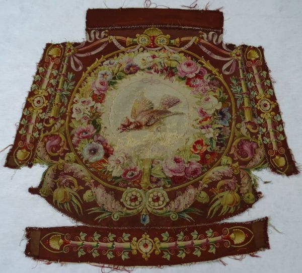 Décor : oiseau sur fond écru entouré d'une riche guirlande florale encadrée par un médaillon, dans un cadre à joyaux. Contrefond marron. Plate-bandes cousues.