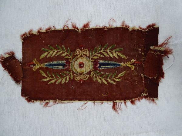Décor: forme du type foudre orné de joyaux et branches à petites feuilles.Contrefond marron rougeâtre.