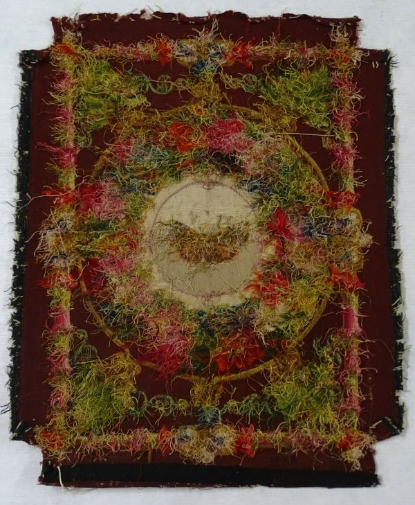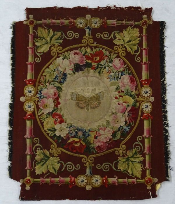 Décor : papillon sur fond écru entouré d'une riche guirlande florale encadrée par un médaillon, dans un cadre à joyaux. Contrefond marron rougeâtre.