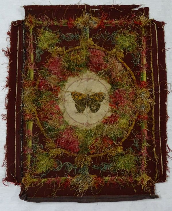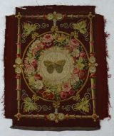 Décor : papillon sur fond écru entouré d'une riche guirlande florale encadrée par un médaillon, dans un cadre à joyaux. Contrefond marron rougeâtre.