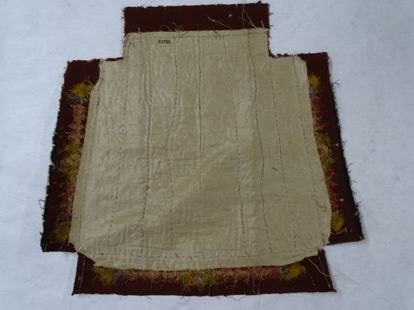 Décor : papillon sur fond écru entouré d'une riche guirlande florale encadrée par un médaillon, dans un cadre à joyaux. Contrefond marron rougeâtre.