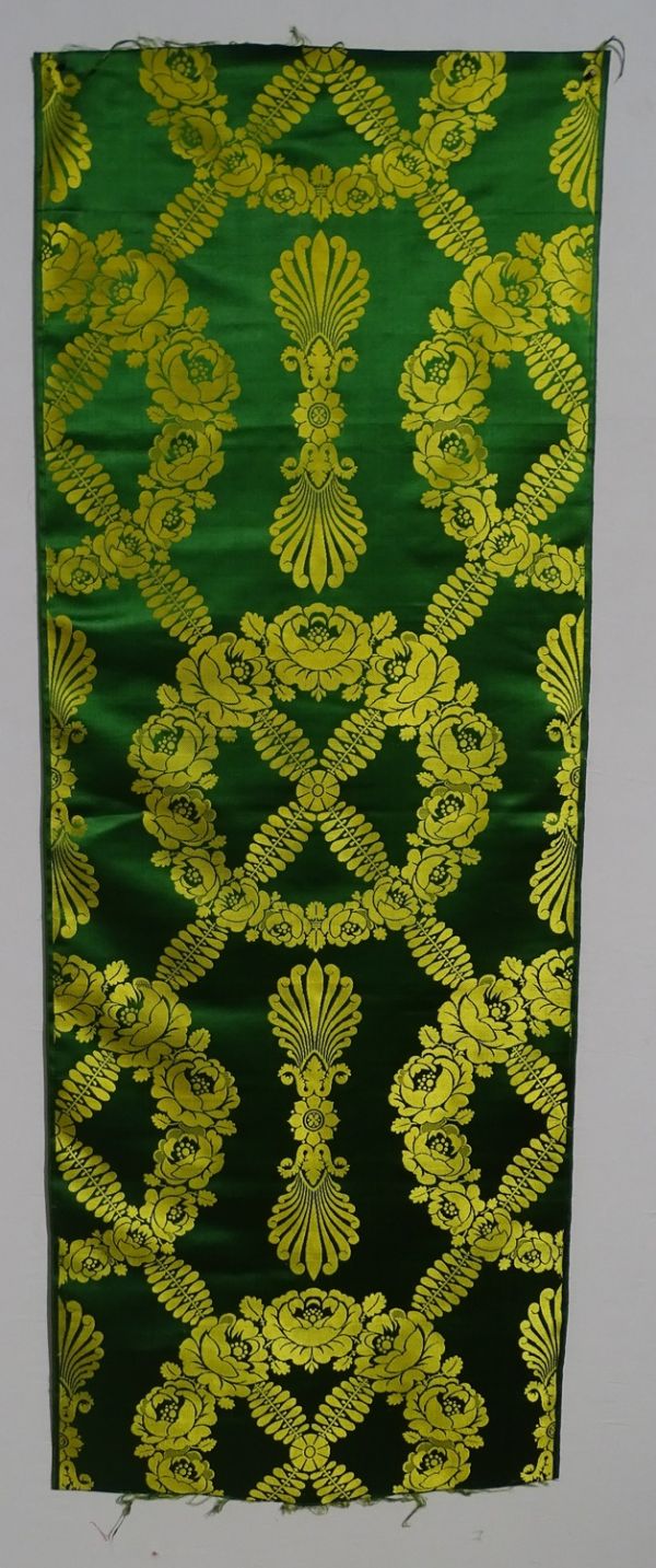 Lé pour tenture, siège et lit en damas en satin vert et jaune à couronnes de roses, petites palmes et guirlandes de feuilles croisées en X.