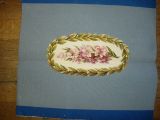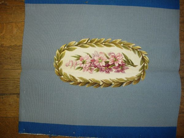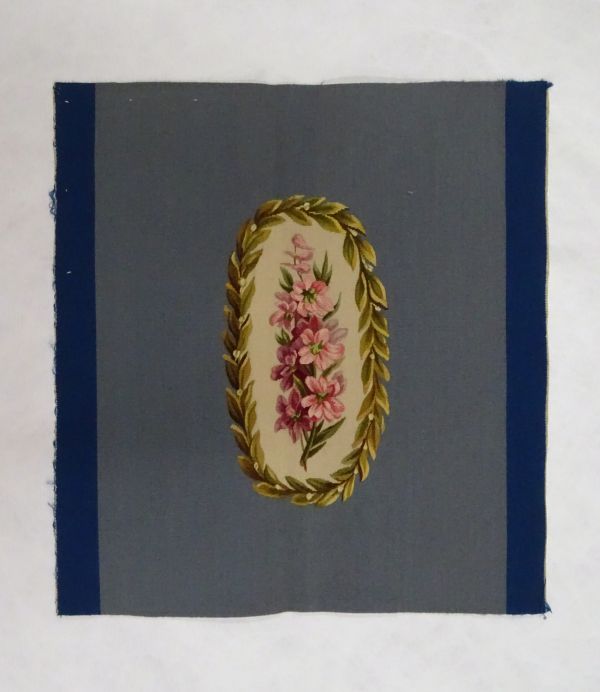 Du meuble n° 21 de la manufacture de Beauvais, à motif de fleurs sur fond blanc et bordure bleue, de style Louis XVI, tissé entre 1909 et 1916 sur des cartons de Florus Aimont datés de 1908-1910 (sièges et écran) et Achille Cesbron (canapé, 1910). L'un des cartons de Florus Aimont est conservé (Beauvais 510). Le meuble reprend le dessin d'une tapisserie de Beauvais du XVIIIe siècle, elle aussi conservée (GMMP 285). Il comprenait à l'origine deux canapés, six fauteuils, six chaises, un écran et deux banquettes ; une partie de ces tissages fut vendue en 1928 ; une autre, soit les garnitures d'un canapé, de quatre fauteuils et de quatre chaises, est conservée non montée au Mobilier national (GMMP 12591 à 12618).