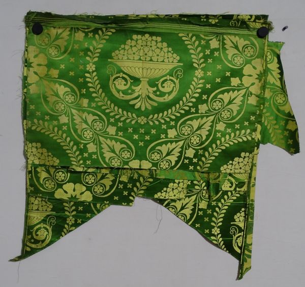 Huit pièces de tissu en damas vert et jaune à compartiments et coupes de fleurs, pour tenture, lits et sièges, cousus ensemble. « Damas 2 couleurs 11/24 Fond vert N°3, lizeré Jaune N° 2... Le Dessin représentant un compartiment de lozanges en Rayes de Cœurs avec une coupe dans le milieu etsemé de petites rosetes ».