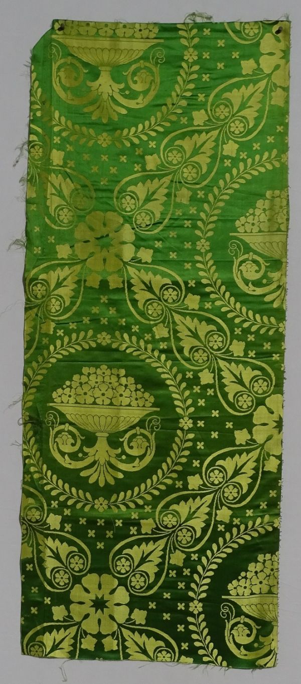Lé de tissu en damas vert et jaune à compartiments et coupes de fleurs, pour tenture, lits et sièges. «Damas 2 couleurs 11/24 Fond vert N°3, lizeré Jaune N° 2... Le Dessin représentant un compartiment de lozanges en Rayes de Cœurs avec une coupe dans le milieu et semé de petites rosetes».