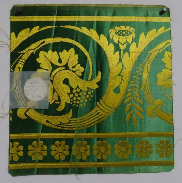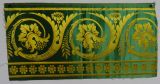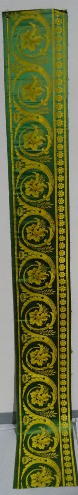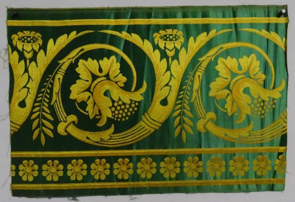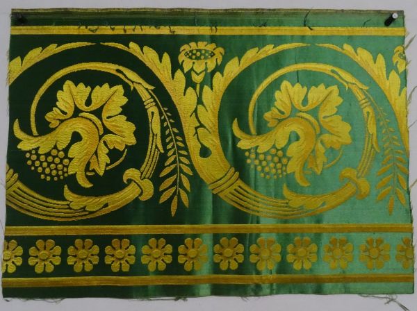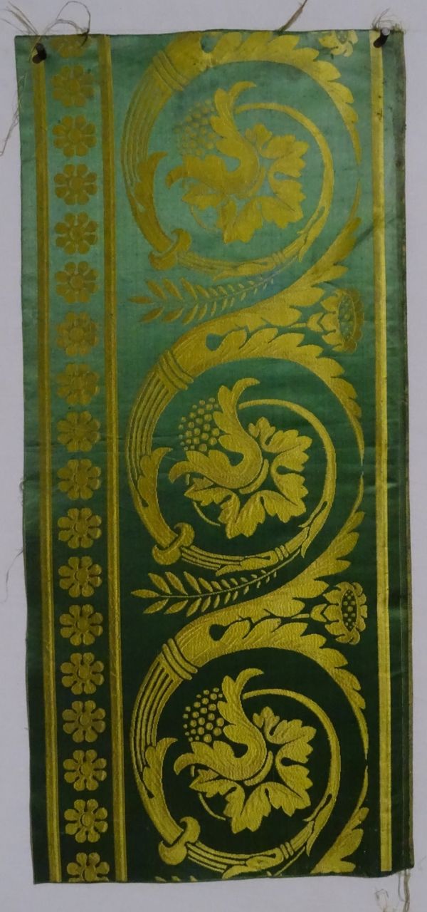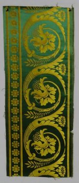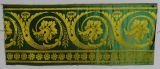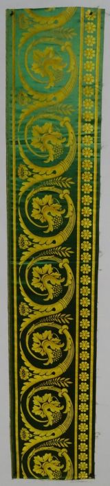 Bordure pour tenture en damas 3 couleurs "fond vert n°3 liseré en 2 couleurs d'or", le dessin représente "un Rinceau avec Rosettes dans le Talon".