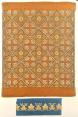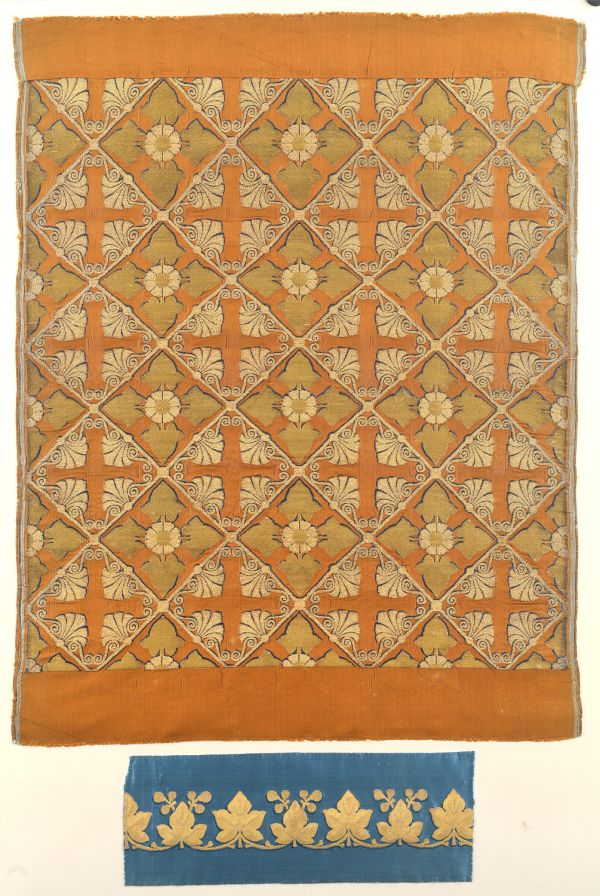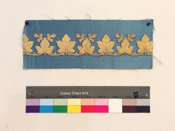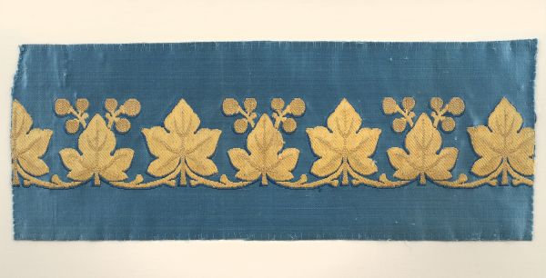 Bordures pour sièges. Satin bleu broché or, dessin suite de feuilles de lierre.