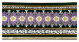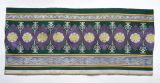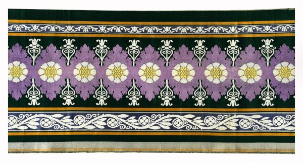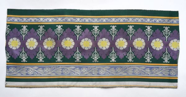 Bordure pour tenture. Damas fond satin renforcé vert et brun liseré gris de lin et blanc. Le dessin représente une suite de fleurettes et ornements, courant de feuillage sur fond aurore dans le talon.