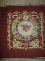 Décor d'oiseaux sur fond beige dans un médaillon entouré d'une guirlande de fleurs en couronne sur fond marron.