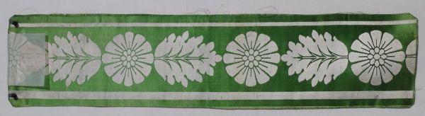 Talon de bordure de tenture en damas 2 couleurs, fond vert n° 2, liseré blanc. Le dessin représente une suite de rosaces et de feuilles.
