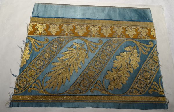 Bordure pour tenture en brocart or sur fond satin bleu de ciel, dessin branches de chêne et de laurier, quadrillé à rosaces et ornements sur un montant, talon de bordure dessin feuilles de lierre sur fond tabac d'Espagne. Brocart or sur un satin, soie, filé et frisé or. La couleur est légèrement passée, le brocart légèrement terni, traces d'agrafes (perforations).