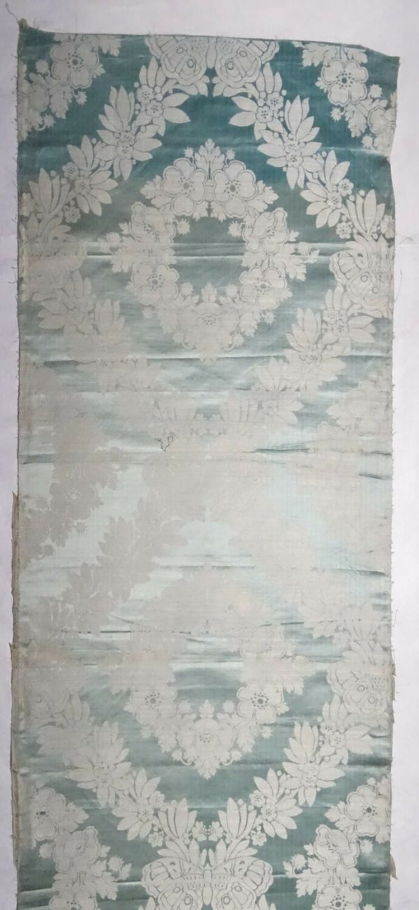 Lé de tenture damassade fond bleu au Vaisseau et fil blanc, Dessin à Branches de myrte, et couronnes de pavots et papillons.