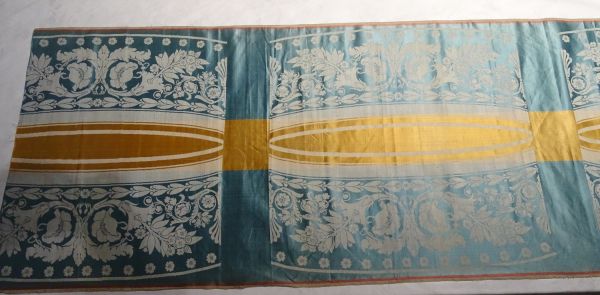 Lé de deux bordures transversales en miroir pour tenture "Arceau fond bleu et Couleur d'or", listel bleu, fil blanc, dessin à rinceaux de fleurs.