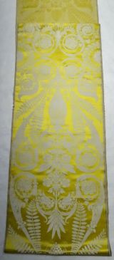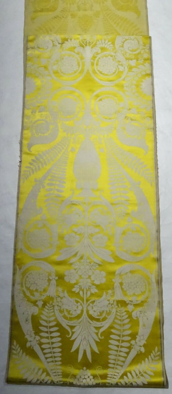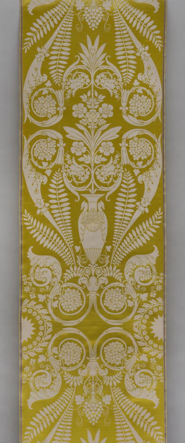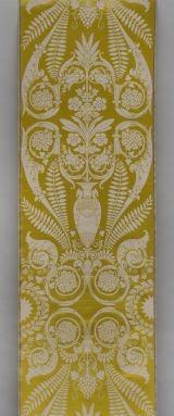 Lé d'étoffe fond satin jaune et motif blanc. Décor de vases avec griffons, bouquets de fleurs et palmettes, fleurs d'hortensias, feuilles de vignes, grappes de raisins, étoiles à 16 branches entourées de couronnes de laurier, rinceaux.